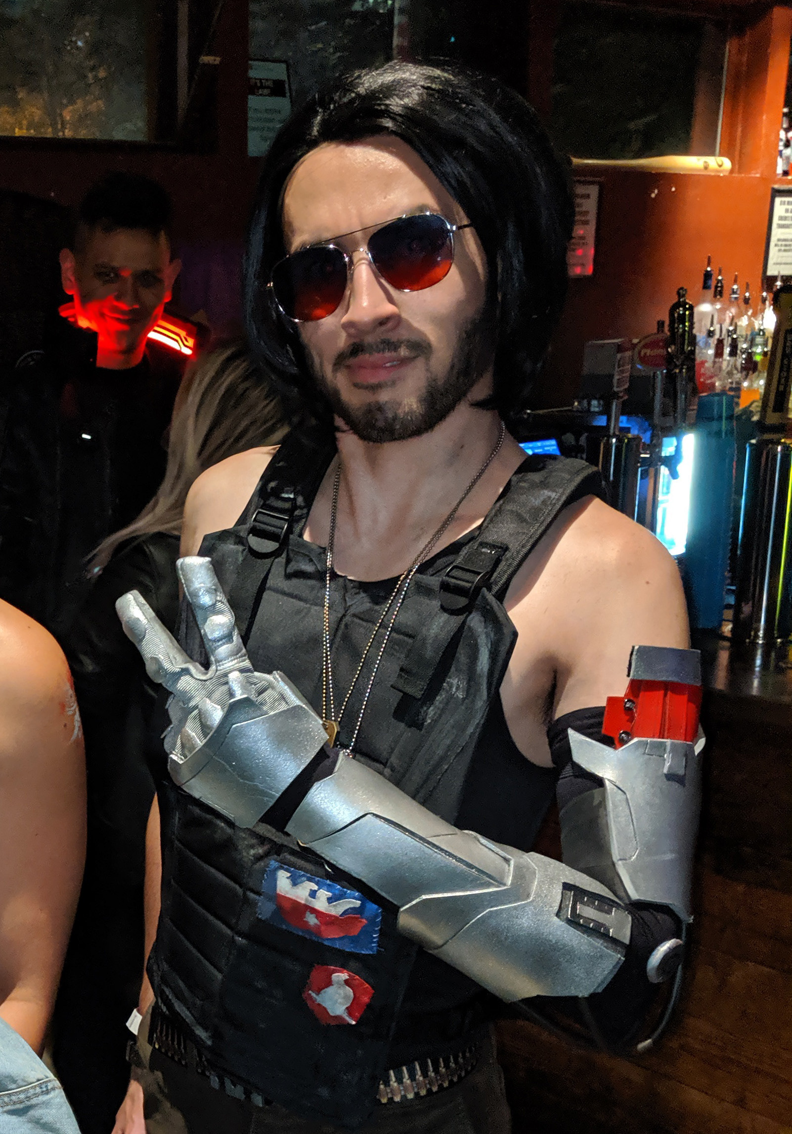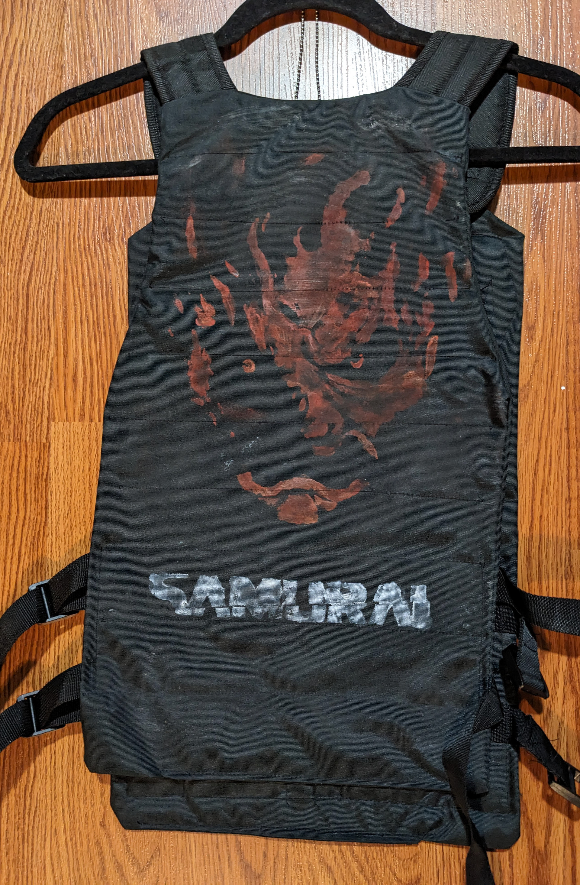 This cosplay was constructed prior to the release of the game; at the time, the character had only just been revealed – appearing in a single trailer (with barely ten seconds of screen time) and a single promotional image. The vest and arm were hand-patterned based on what I could glean.