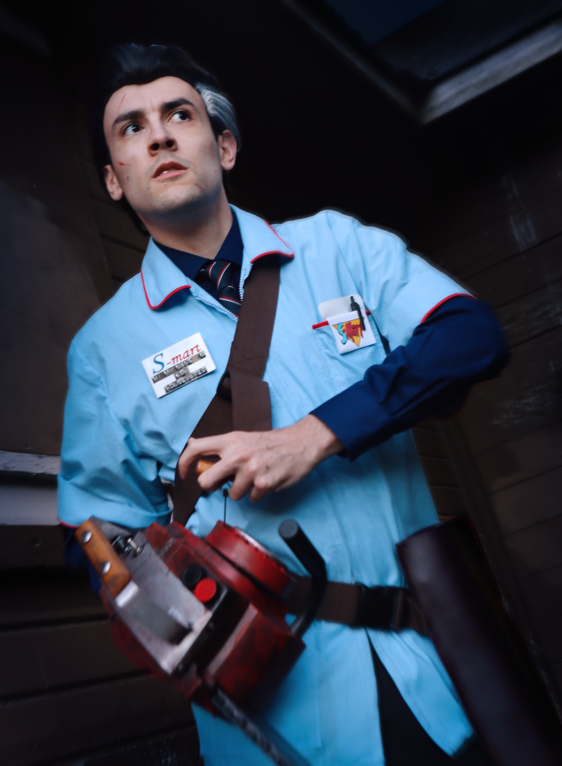 The webbing harness is hand-made to fit me; I revised and remade it multiple times to better match its onscreen design. The S-Mart employee smock was modified from a pattern to include the chest pocket, piping, and sleeve cuffs of the film costume.